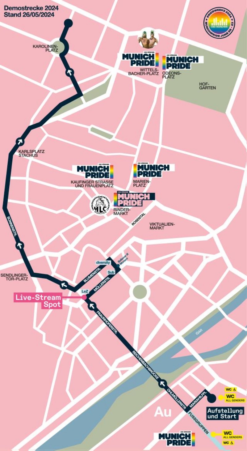 You may have heard that the far right AfD has the audacity to hold a rally at Stachus at the same time the parade passes there. This will not be a problem, because as usual, their rally will be fenced in, and they’ll be behind the big fountain. So we don’t have to worry about them.